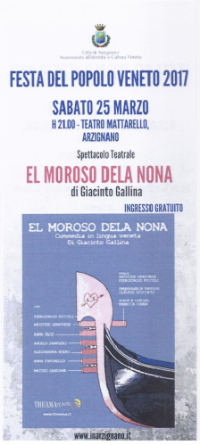 Il 25 Marzo, la Regione Veneto ha istituito la “Festa del Popolo Veneto”. Alle ore 21 al Teatro Mattarello siete tutti invitati alla rappresentazione “EL MOROSO DELA NONA”. Ingresso Gratuito.