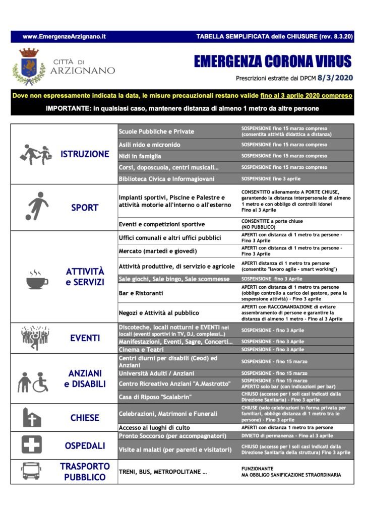 Pubblichiamo la tabella realizzata dal Comune di Arzignano con le indicazioni e prescrizioni in atto con l’emergenza Coronavirus.