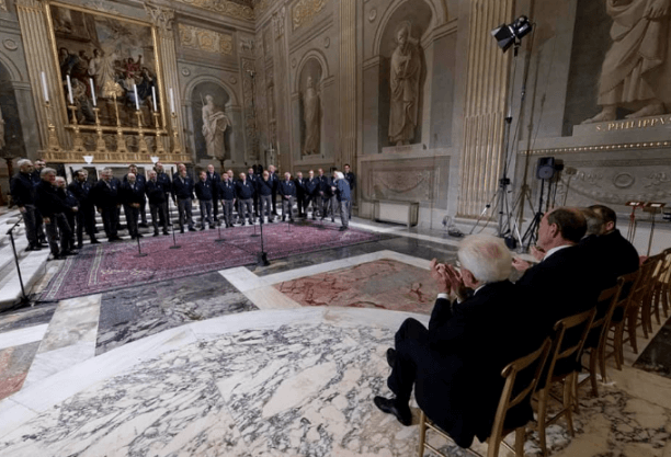 “Sabato pomeriggio, dopo aver ricevuto la nomina a commendatore, Bepi De Marzi ha offerto con i Crodaioli un particolare concerto al Presidente Mattarella e ai suoi più stretti collaboratori nella Cappella Paolina del Quirinale. Sono stati i canti più significativi del repertorio espresso lungo i 22mila giorni di attività canore. Prima di concludere con Signore delle Cime è stata letta la poesia di Carlo Geminiani ispirata dai libri di Giulio Bedeschi. Poi, con un pensiero particolare all’Altopiano di questi giorni tormentati, ma anche a ciò che è stato 100 anni fa, ecco le parole di Mario Rigoni Stern date a De Marzi una ventina di anni fa. Dopo la consegna al Presidente delle ultime incisioni del coro e di alcune pubblicazioni donate dagli Alpini di Arzignano per mano del loro rappresentante Luca Dal Molin, è stato proposto l’indimenticabile “Sulla strada del Monte Pasubio”, che racconta la tragedia di lassù con lo scoppio della mina. Un pomeriggio indimenticabile per i coristi che alla fine si sono stretti affettuosamente intorno al Capo dello Stato, affabile come sempre”. Oggi alle 11.50 i Crodaioli saranno in diretta radiofonica su RadioTre per il concerto dalla Cappella Paolina in Quirinale