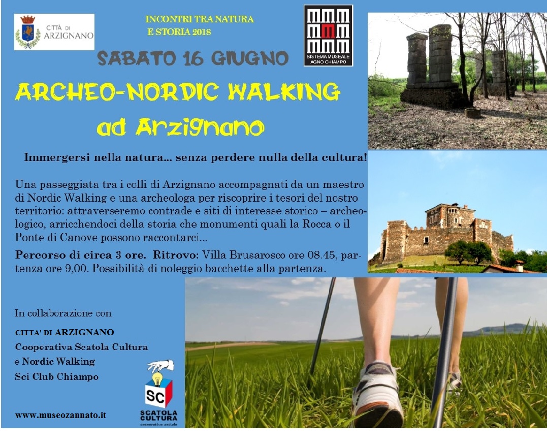Nell’ambito degli Incontri tra Natura e Storia il Sistema Museale Agno-Chiampo – Museo Zannato propone per domani sabato 16 giugno ARCHEONORDIC WALKING, una passeggiata tra strade e colli di Arzignano accompagnati da un maestro di Nordic Walking e una storica locale per riscoprire i tesori del nostro territorio. Attraverseremo contrade e siti di interesse storico-archeologico, dalla Rocca ed il suo borgo, al Ponte romano a passerella di Via Canove, recentemente interessato da un’ intensa ripulitura dell’area. Possibilità di noleggio delle bacchette alla partenza. In collaborazione con Città di Arzignano, Scatola Cultura coop e Nordic Walking Sci Club di Chiampo. Ritrovo ore 8.45, partenza ore 9.00 da Villa Brusarosco, Arzignano