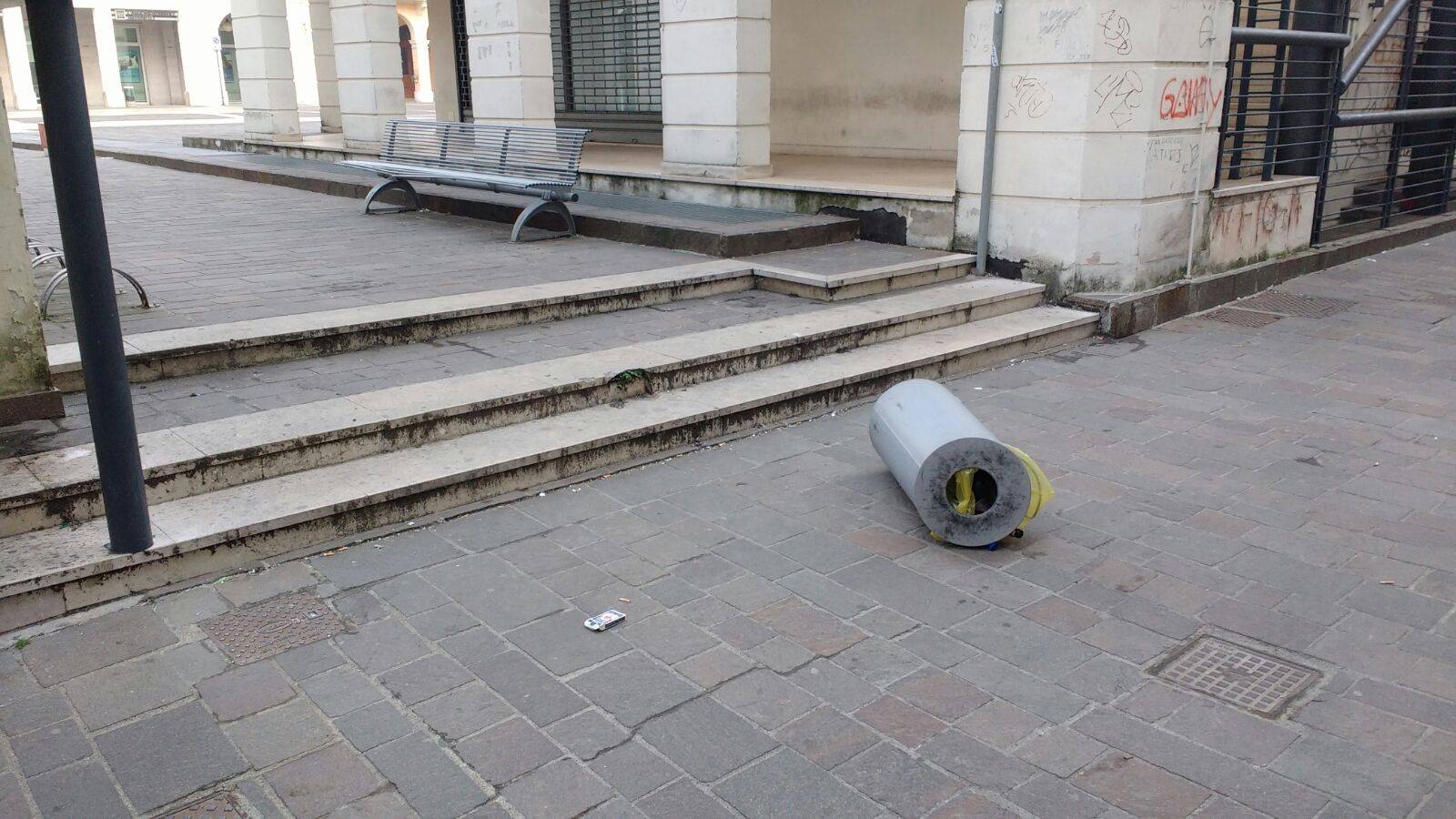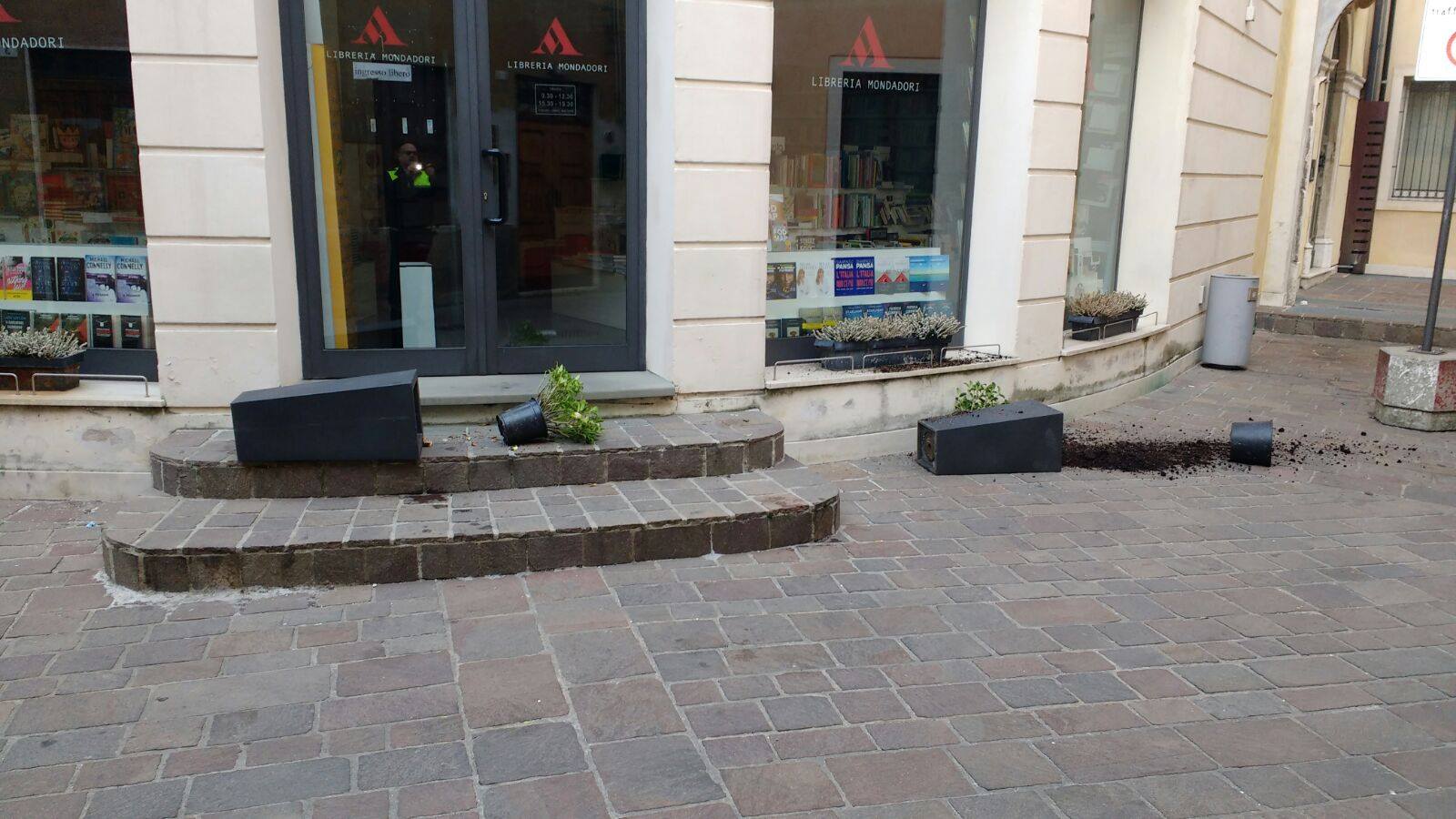 Vicolo Rizzetti, dove è stato aperto un vano contatori, vi sono state depositate delle bottiglie di vetro, il cestino rifiuti posto davanti alla biblioteca è stato divelto e gettato in vicolo Rizzetti e sono stati buttati a terra i vasi posti di fronte all’entrata della libreria Mondadori.