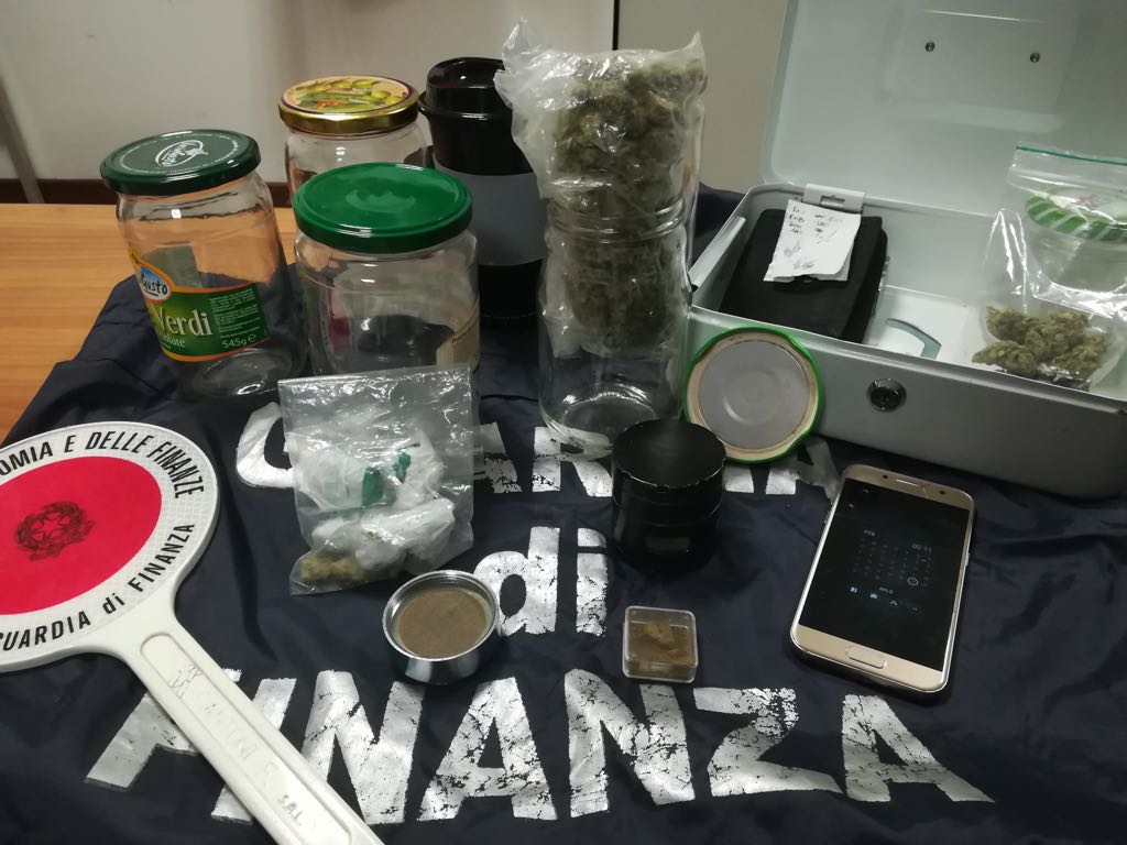 residente in città , sequestrando 49 grammi di marijuana e 4 di hashish. I militari avevano infatti notato, sul marciapiede della Strada Provinciale 31 all’altezza di via Puglie, un giovane che, con fare circospetto, stava parlando con un altro e riceveva un qualcosa che, agli occhi dei finanzieri in appostamento, sembrava essere droga. L’ipotesi è stata subito confermata dal controllo effettuato subito nei confronti del “cliente”, che aveva con sé un involucro contenente pochi grammi di marijuana, per uso personale. Portato negli uffici della Compagnia, il giovane ha rivelato l’identità e la dimora del proprio fornitore. I militari si sono quindi recati al domicilio trovando proprio M. A., 23 anni, di origine napoletana, sul ciglio della strada, in attesa di qualcuno o qualcosa. Sottoposto a controllo, lo stesso ha consegnato ai Finanzieri 9 grammi di marijuana , contenuti in una bustina trasparente e già suddivisa in dosi pronte ad essere smerciate. I militari, quindi, hanno perquisito la casa ed il garage, con l’aiuto dell’unità cinofila. Qui sono stati rinvenuti due barattoli di vetro contenenti altra marijuana” del peso di 40 grammi, e numerosi altri vasetti con residui della stessa sostanza. Grazie al fiuto del cane “Zack”, inoltre, nella camera da letto di M. A. sono stati trovati una piccola confezione di plastica contenente 4 grammi di hashish e 2 grinder, strumenti utilizzati per sminuzzare la droga. Il giovane napoletano è stato quindi arrestato in flagranza di reato.