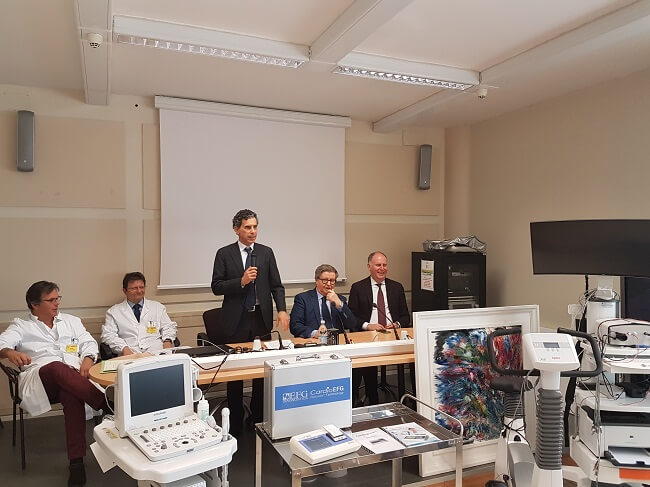 Sono destinate invece all’Unità Operativa di Cardiologia altre due importanti donazioni: un ergospirometro correlato di elettrocardiografo per l’esecuzione di test da sforzo cardiopolmonare, grazie alla generosità dell’azienda Trevisan Macchine Utensili di Sovizzo, e un analizzatore vettoriale di bioimpedenza – per la valutazione bioimpedenziometriche – da parte della Fondazione Antonio Ferrari di Arzignano. Il test cardiopolmonare e la bioimpedenziometria rappresentano strumentazioni importanti, in quanto permettono l’ottimizzazione della terapia medica e l’individuazione precoce di pazienti a rischio di ospedalizzazione e di complicanze cliniche. Tali apparecchiature, inoltre, assicurano la possibilità di offrire un’assistenza qualitativamente elevata in particolare ai pazienti affetti da scompenso cardiaco cronico che rappresenta la prima causa di morte in Italia. Più in dettaglio, Il test da sforzo cardiopolmonare è un esame strumentale diagnostico non invasivo che permette di valutare l’adattamento allo sforzo sia nei soggetti sani che in quelli affetti da patologie cardiache e/o polmonari. Rispetto ad un normale elettrocardiogramma da sforzo, permette di valutare oltre all’andamento dell’elettrocardiogramma sotto sforzo, anche il metabolismo cardiaco e i parametri ventilatori, come il consumo di ossigeno e la produzione di anidride carbonica. L’insieme di questi indici aiuta a comprendere l’adattamento all’esercizio fisico da parte del paziente dal punto di vista cardiaco, polmonare, muscolare e metabolico. Dal punto di vista cardiologico il test cardiopolmonare trova la sua applicazione nella valutazione del paziente affetto da scompenso cardiaco, nella cardiopatia ischemica e nella riabilitazione cardiologica: è inoltre un test indicato alle persone affette da patologie respiratorie (bronchite cronica, enfisema polmonare) fornendo indicazioni importanti sulla gravità della malattia e sulla sua evoluzione e permette di valutare l’eventuale approccio terapeutico-riabilitativo. Infine può essere utilizzato in ambito sportivo per valutare il grado di allenamento dell’ atleta e identificare le strategie più efficaci per migliorarne la performance.