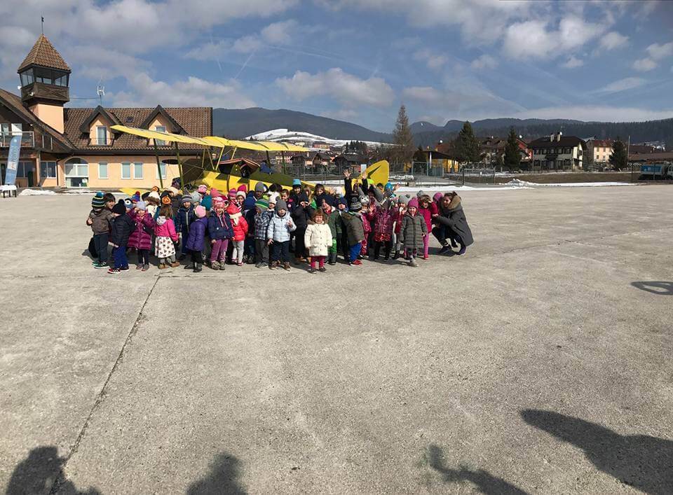 Erano 56 i bambini della Scuola Statale dell’Infanzia che hanno disegnato un grandissimo aereo sul piazzale dell’Aeroporto di Asiago. E lo hanno fatto nel modo più originale…mettendosi in ordinata fila, e grazie all’impegno delle maestre, hanno dato vita ad un aereo grande come quelli che sono passati sopra di loro per tutta la mattina e che hanno avuto modo di vedere anche all’interno dell’hangar. Il Presidente Bruno Zago, a cui si deve il rilancio dello scalo del più alto Aeroporto d’Italia, ha voluto regalare a ciascuno una speciale maglietta, realizzata appositamente per la loro visita. L’iniziativa ha fatto velocemente il giro degli aeroporti veneti, e sono stati diversi i piloti che questa mattina in volo sulle Alpi hanno deviato la loro rotta proprio per fare un passaggio di saluto agli entusiasti bambini.