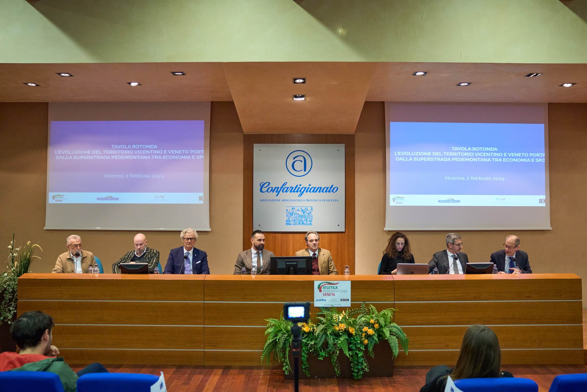 Nella foto: i relatori della tavola rotonda “l’evoluzione del territorio vicentino e veneto portata dalla SPV” in occasione la presentazione nazionale di Atletica Pedemontana Veneta del 2 febbraio 2024.