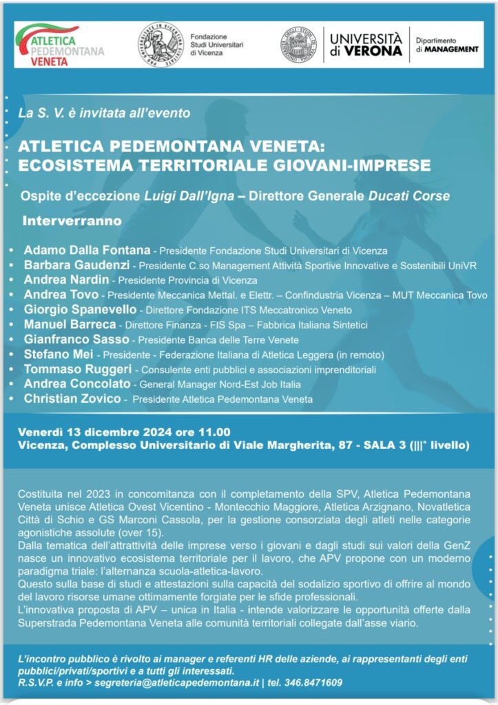 Le linee guida dal progetto – che proporrà un innovativo paradigma triale di alternanza Scuola-Atletica-Lavoro anche per favorire l’attrattività delle imprese verso i giovani della “Genz” – e della sua attuazione saranno rispettivamente illustrate da Christian Zovico presidente di Atl. Pedemontana Veneta e da Andrea Concolato general manager Nord-Est Job Italia, agenzia incaricata di profilare gli atleti-studenti e condurli in maniera ideale verso le aziende che investiranno nel consorzio sportivo, con precise attività rafforzative del proprio CV. A Tommaso Ruggeri il punto di vista sociologico sulla necessità di creare reti sinergiche o “ecosistemi territoriali” (definizione del sociologo vicentino Daniele Marini) tra associazionismo e imprenditoria, quale antidoto allee comunità fragili. Previsto un video-intervento dell’europarlamentare Elena Donazzan, per 20 anni assessore veneta a Istruzione Formazione e Lavoro, tra le ispiratrici di questa piattaforma e le conclusioni saranno tratte da Luigi Dall’Igna, direttore generale di Ducati Corse.