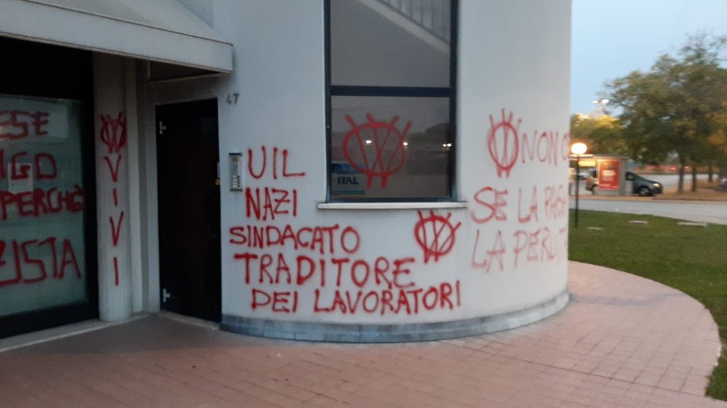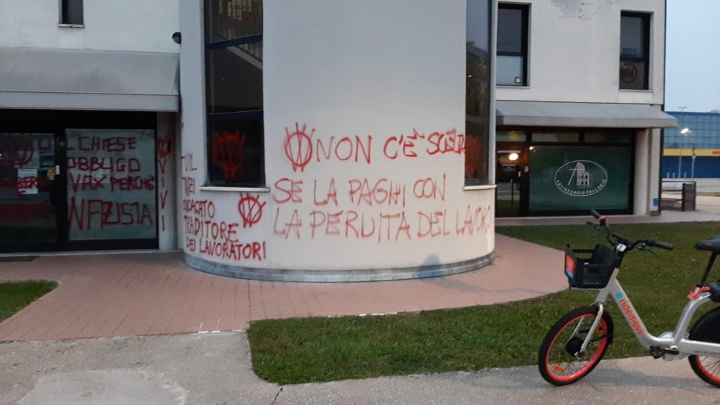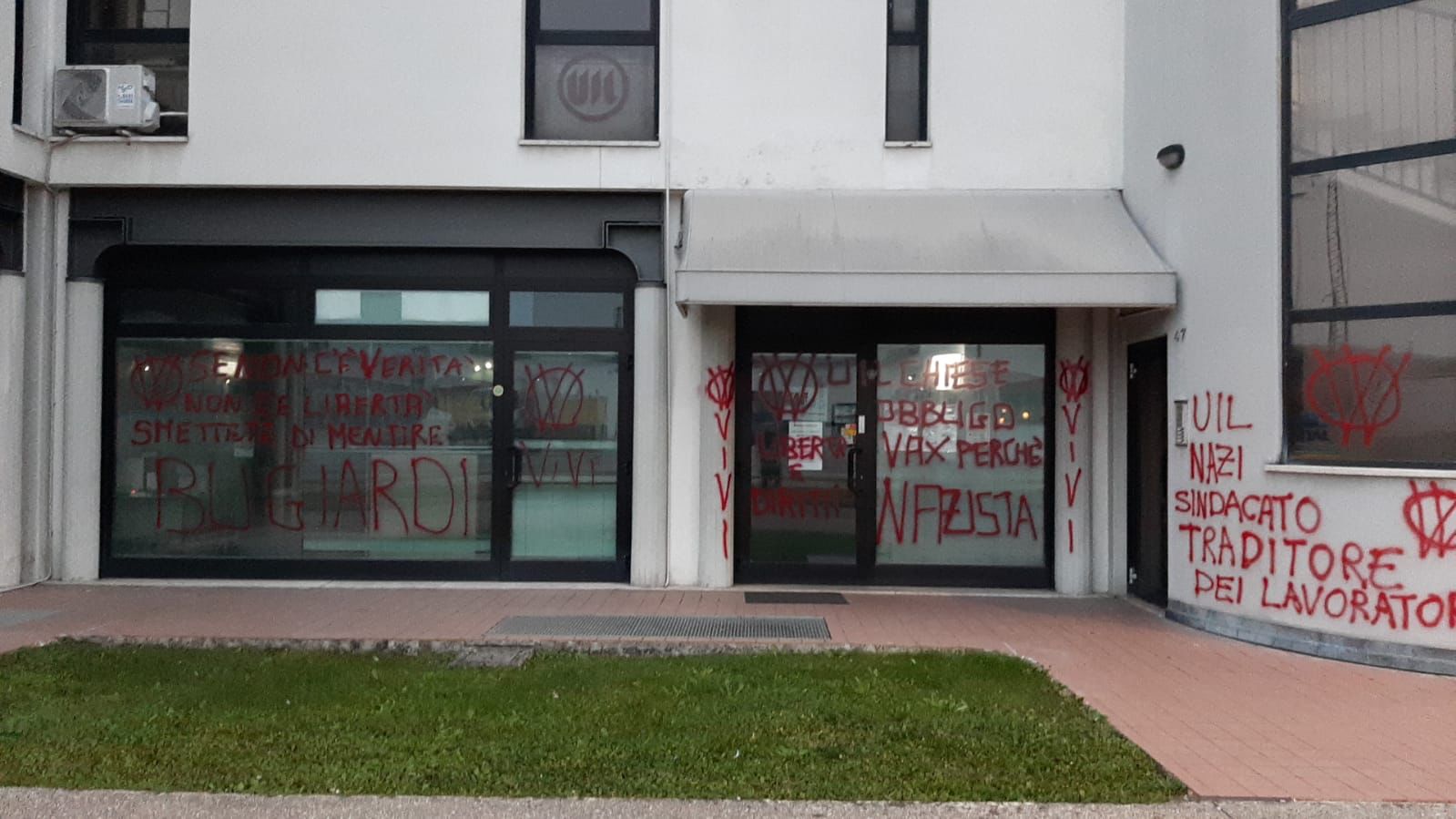 Attacco No-Vax alla sede UIL, Caaf CGIL e Agenzia delle Entrate di Vicenza: scritte con vernice rossa (foto)