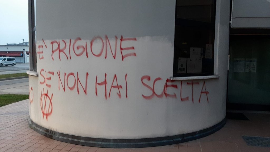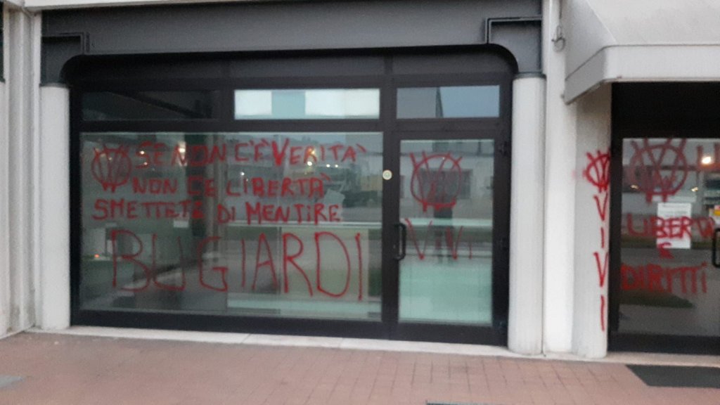 Tornano a farsi sentire i No-Vax con un’azione dimostrativa nella notte. Ignoti hanno imbrattato le porte d’ingresso e le vetrate della sede UIL di Vicenza, del Caaf della CGIL e dell’Agenzia delle Entrate. Nelle scritte i soliti messaggi firmati con una W rossa cerchiata, simbolo dei complottisti e frasi di questo tenore: “E’ prigione se non hai scelta”, “Uil Nazi sindacato traditore dei lavoratori”, “Se non c’è verità non c’è libertà, smettete di mentire bugiardi”, “UIL chiese obbligo vax perché nazista”.