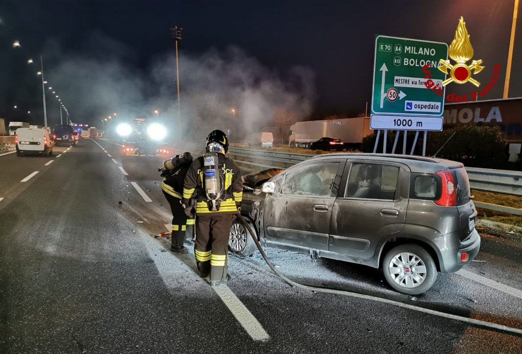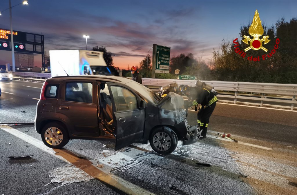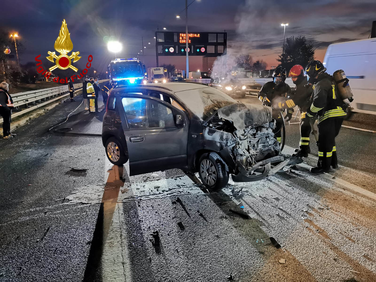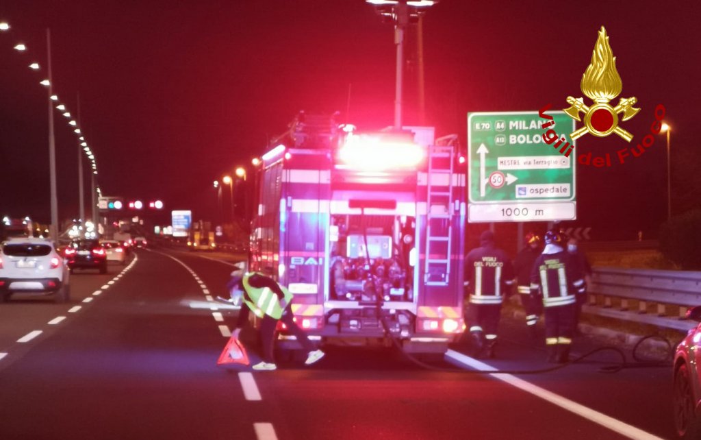 Questa mattina all’alba, i vigili del fuoco sono intervenuti sulla tangenziale di Mestre A57, nei pressi dell’area di servizio Bazzera Nord per un incendio di un’auto dovuto ad un tamponamento con un mezzo pesante: ferito il conducente del mezzo leggero. I pompieri arrivati da Mestre, hanno del tutto spento le fiamme, già abbassate dal pronto intervento dell’autista del camion, che ha utilizzato un estintore. Il conducente dell’auto rimasto ferito è stato preso in cura dai sanitari del Suem e trasferito in ospedale. sul posto il personale ausiliario Autovie Venete e la Polstrada. Le operazioni di soccorso dei vigili del fuoco sono terminate dopo circa un’ora.