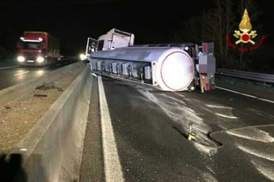Autocisterna di gasolio si rovescia in autostrada: 30mila litri travasati