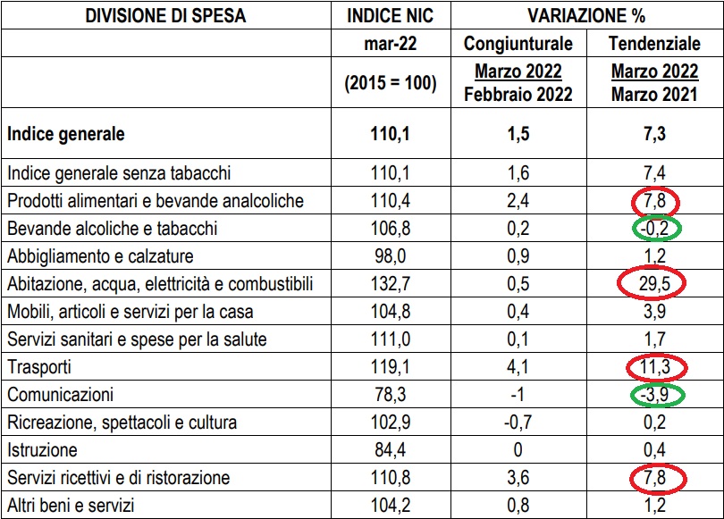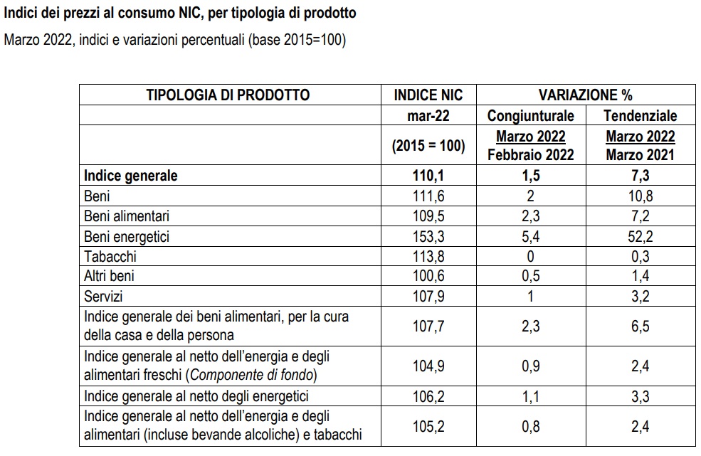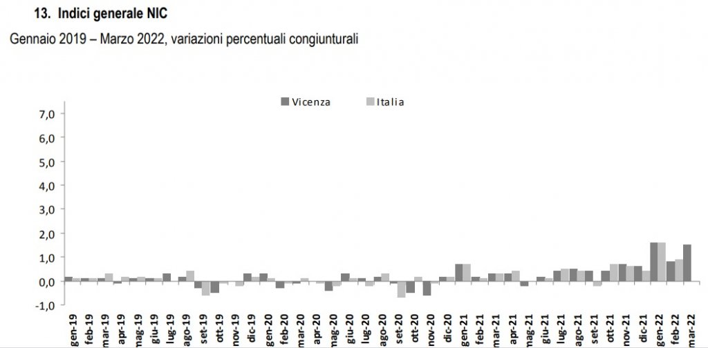 Nel mese di Marzo 2022 l’indice dei prezzi al consumo per l’intera collettività (NIC) nel comune di Vicenza ha registrato una variazione di +1.5% rispetto al mese precedente e di +7.3% rispetto allo stesso mese dell’anno precedente. Indici dei prezzi al consumo NIC Marzo 2022, indici e variazioni percentuali (base 2015=100)