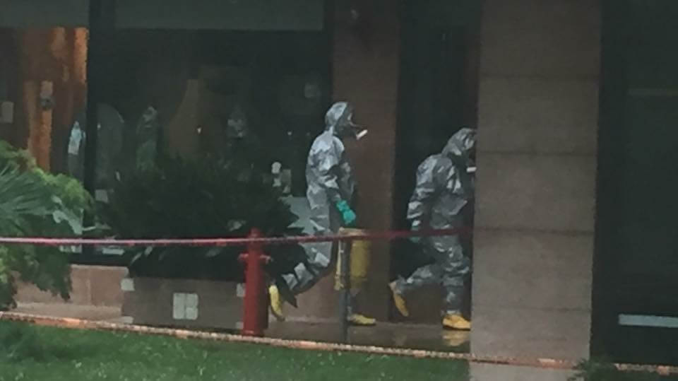 Immediata la procedura di sicurezza, con l’isolamento degli uffici e la quarantena delle persone che si trovavano all’interno. Sul posto polizia, carabinieri, vigili del fuoco, 118 e polizia locale.