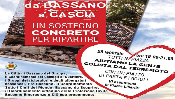 BASSANO – Da Bassano a Cascia. Questo il titolo dell’iniziativa che pensata dalla città ai piedi del Grappa con il coordinamento dei consigli di quartiere, il gruppo dei ristoratori e albergatori bassanesi, la Pro Bassano e molte altre associazioni che si sono riunite per trasformare i festeggiamenti del Carnevale in un momento di solidarietà per i terremotati del Centro Italia. Un piatto di pasta e fagioli in piazza Libertà, dalle 19.00 alle 21.00 di domani, martedì grasso, per dare un aiuto semplice e concreto a chi si trova in grande difficoltà. Un piccolo gesto inserito all’interno del vasto e ricco programma del Carnevale di Bassano che si concluderà, appunto, nella giornata di domani.