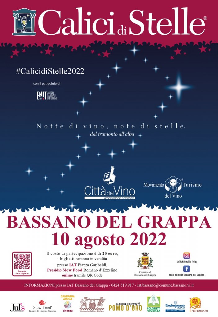 La seconda edizione a Bassano di “Calici di Stelle”, manifestazione dedicata alle eccellenze vinicole, è programmata in città per il prossimo 10 agosto. Viene promossa dal Comune di Bassano del Grappa nell’ambito dell’Associazione Città del Vino in collaborazione con la Compagnia dei Canevaroli (Leonardo Fiorese), Condotta Slow Food (Letizia Bonamigo) e con la partecipazione delle associazioni di categoria Confartigianato, Coldiretti, Campagna Amica e con il supporto logistico della ProBassano.