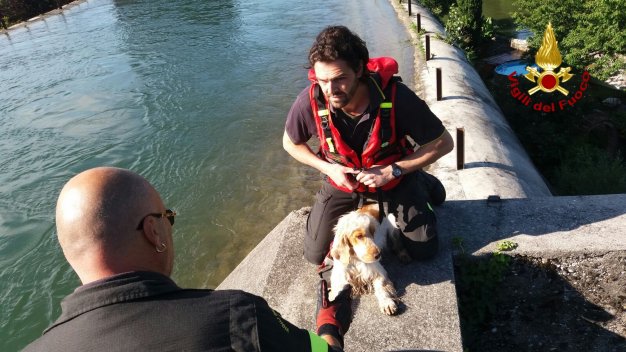 Questa mattina i vigil del fuoco hanno recuperato un cane presso lo sbarramento idraulico di Ca’ Erizza a Bassano del Grappa. L’allarme poco prima delle 8, quando alcuni passanti hanno sentito il lamento del cane riuscito a risalire sul muretto dello sbarramento d’acqua. I pompieri del locale distaccamento hanno raggiunto il cocker spaniel inglese, che docilmente si è fatto recuperare e portare in luogo sicuro. Il cane è stato coccolato e rifocillato dal personale, nell’attesa del cinovigile che l’ha trasportato presso la struttura veterinaria del comune per la lettura del chip e la riconsegna al padrone.