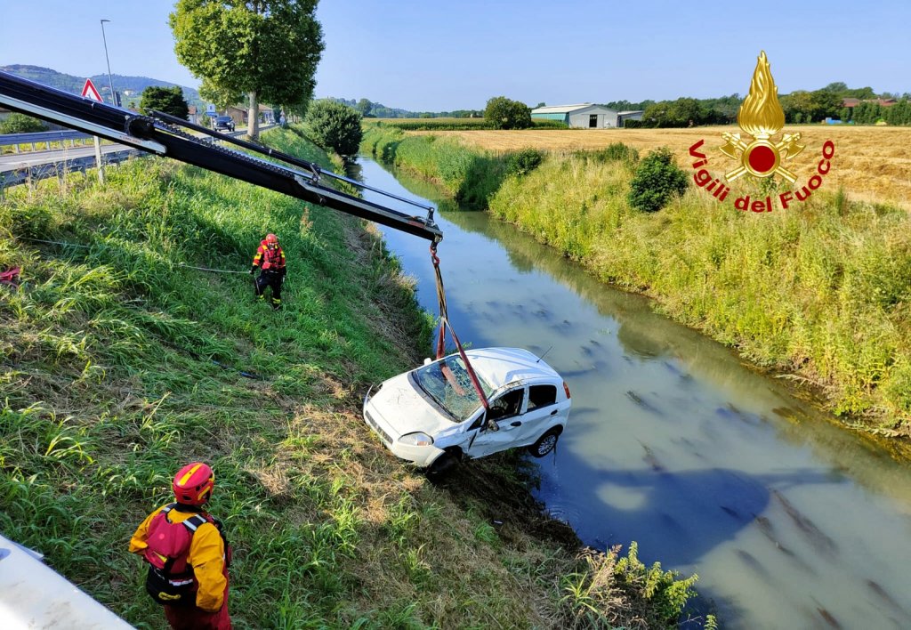 Lunedì poco prima delle 7:30, i vigili del fuoco sono intervenuti alla rotatoria che incrocia la SP 500 e la strada di Meledo Alto a Sarego per lo scontro tra due auto, di cui una finita sei metri più in basso nel fiume Brendola: ferita la conducente. I pompieri arrivati da Lonigo, hanno aperto la porta bloccata della Fiat Punto, facendo uscire la donna alla guida, che è stata aiutata a risalire la sponda ed essere presa in cura dai sanitari del Suem. Illeso l’automobilista alla guida della Volkswagen Polo. Gli operatori dei vigili del fuoco hanno poi agganciato l’auto recuperata da un carro attrezzi. I carabinieri e la polizia locale hanno deviato il traffico ed eseguito i rilievi dell’incidente. Le operazioni di soccorso dei vigili del fuoco sono terminate dopo circa un’ora.