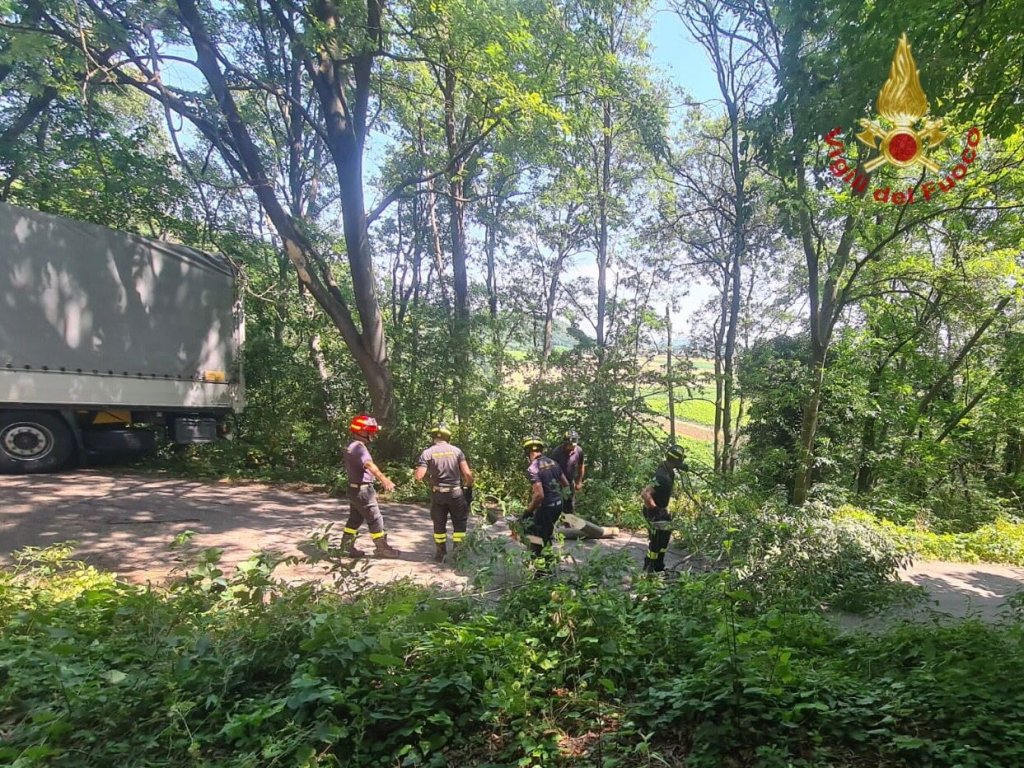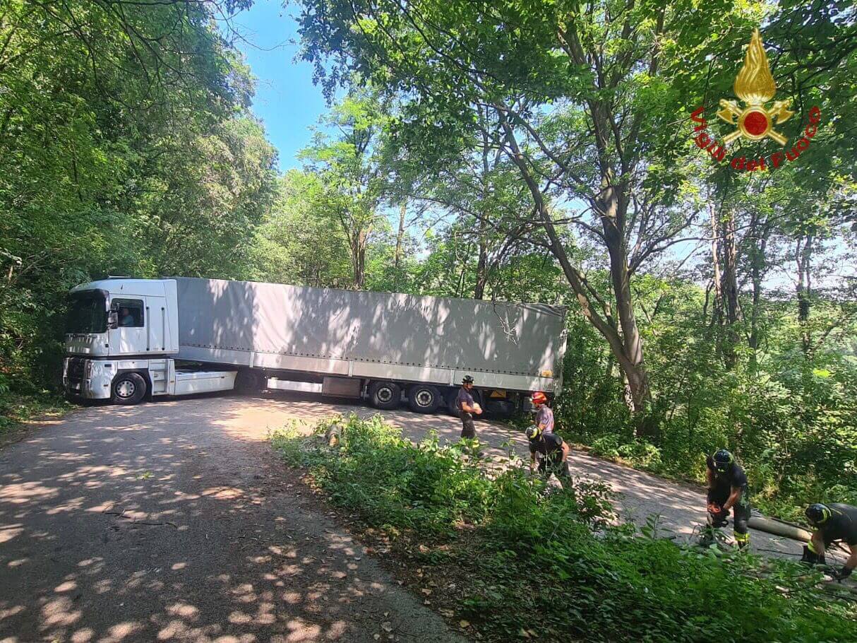 L’autista di un mezzo pesante si è smarrito seguendo le indicazioni del navigatore e rimane incastrato sotto le fronde degli alberi, sulla salita per San Pancrazio, nel comune di Barbarano Mossano.