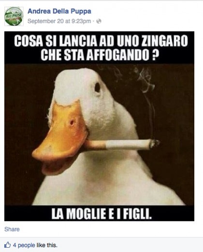 Il politico della Marca aveva pubblicato una vignetta-foto nella quale un papero con una sigaretta in bocca ‘diceva’. “Cosa si lancia ad uno zingaro che sta affogando? La moglie e i figli”.