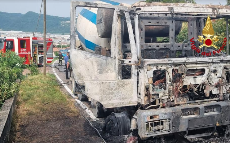 Betoniera in fiamme: ferito il conducente (FOTO&VIDEO)