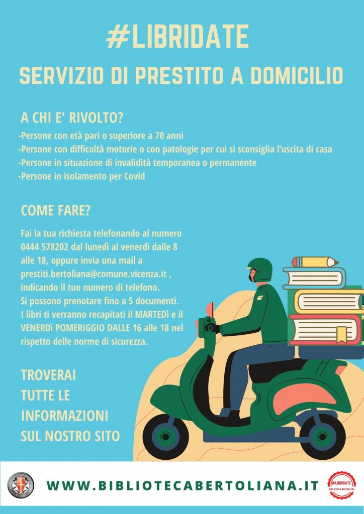 #LibridaTe è il servizio di consegna di libri e audiovisivi della Rete Biblioteche Vicentine direttamente a casa degli utenti residenti nel comune di Vicenza iscritti alla biblioteca e momentaneamente impossibilitati a recarvisi di persona.