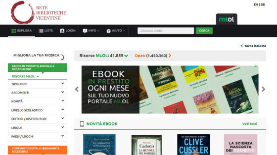 La Bertoliana aderisce al servizio Media Library OnLine (Mlol). Con Mlol si può usufuire di varie tipologie di contenuti digitali: migliaia di titoli ebook dei principali editori italiani; l’edicola digitale che consente la lettura di quotidiani e giornali, oltre 800 audiolibri in streaming, l’ascolto di musica (spotify), e nella sezione open si può accedere a spartiti musicali, e-learning, periodici scientifici, banche dati, videogiochi.