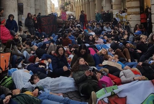 Anche a Vicenza gli studenti hanno aderito al quarto sciopero globale per il clima ed hanno sfilato lanciando un messaggio affinché vengano attuate concrete ed immediate politiche per il clima. Una manifestazione rinforzata nel suo senso anche dai recenti disastri derivati dal maltempo (vedi Venezia). Il corteo è partito alle 9 dal piazzale della Stazione e toccando luoghi simbolo della città. Una manifestazione caratterizzata dai colori, ognuno dei quali determinava un ‘obiettivo’. Un blocco rosso si è portato davanti al Comune per dire basta alla cementificazione e ai supermercati. Un blocco verde blocca Benetton, per dire basta fast fashion, basta deforestazioni, basta sfruttamento dei territori. Un blocco Blu blocca Confindustria per dire Basta grandi opere e un Blocco giallo blocca Intesa San Paolo, per dire a basta finanziamenti al carbone fossile!