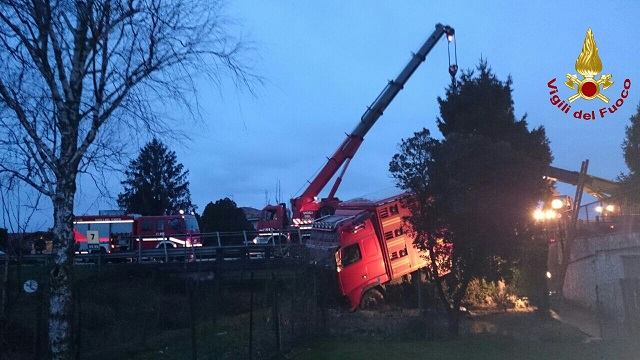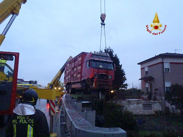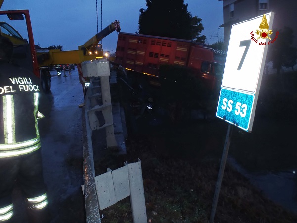 Ecco le foto inviateci dai Vigili del Fuoco da Bolzano Vicentino, dove stamane verso le 4, un grave incidente ha coinvolto due autovetture ed un camion. Il mezzo pesante e una delle due auto sono precipiti dal cavalcavia sulla Statale Pasubio. Gravissimo il conducente dell’auto, ora ricoverato in rianimazione al San Bortolo di Vicenza. Per liberarlo dalle lamiere ci sono volute più di due ore.