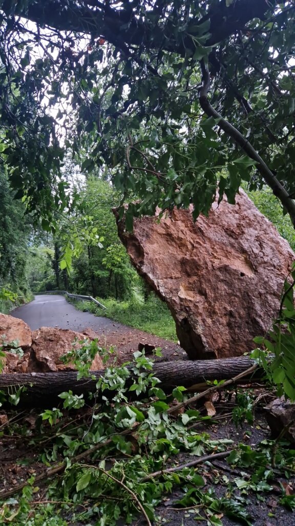 Gravi disagi a Crespadoro dove strada Ferrazza/Campodalbero è stata investita da una frana con grossi massi ed alberi (foto qui sotto)
