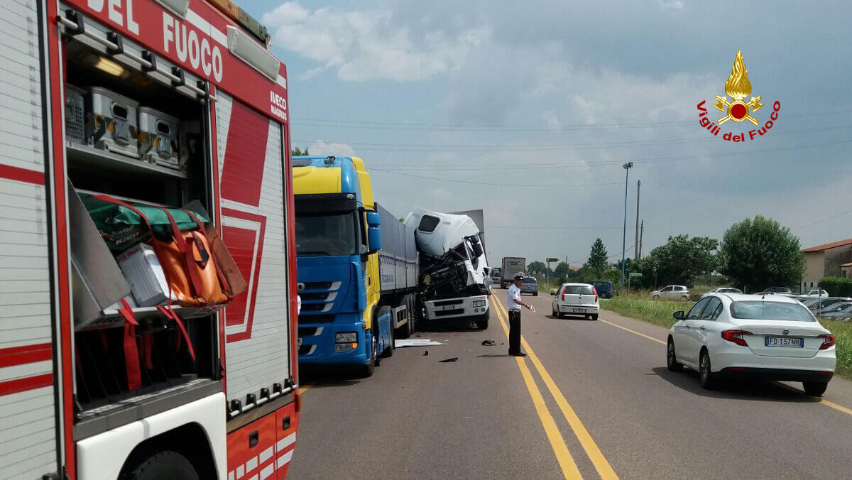 I vigili del fuoco sono intervenuti alle ore 12, lungo la Gasparona all’altezza dello stabilimento della Laverda a Breganze per un tamponamento tra due mezzi pesanti che ha causato forti rallentamenti. Lievi ferite per il conducente del camion tamponatore, uscito autonomamente dalla cabina, andata completamente distrutta. I pompieri di Bassano hanno messo in sicurezza i mezzi. Sul posto la polizia locale per i rilievi del sinistro e per dirigere la circolazione veicolare alternata su una sola corsia. Le operazioni di soccorso dei vigili del fuoco sono terminate dopo circa due ore.
