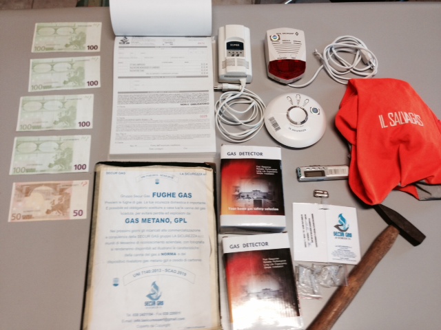 Dopo la perquisizione è stato trovato in possesso del denaro appena truffato che verrà restituito alla vittima, di un blocchetto di ricevute sulle quali sono riportati dati di altre persone che si ritiene possano aver subito la medesima truffa, altri congegni (rilevatori di monossido di carbonio) necessari per portare a compimento la truffa.