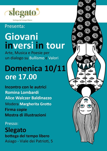 Chiude il weekend di eventi l’appuntamento di domenica 10 novembre nella suggestiva cornice di Asiago, alle 17.00, alla SLEGATO – Bottega del tempo (Viale dei Patrioti, 5). Le autrici, in dialogo con la giornalista e speaker radiofonica Margherita Grotto saranno le prime ospiti della stagione di Marta e Luca, i proprietari di questa particolare “bottega” – ricca di libri, giocattoli, artigianato e strumenti musicali – con la passione per “l’educazione divertente”, come definiscono la loro missione. (Per informazioni: 333/ 173 3971). Anche in questo caso sarà possibile ammirare una personale di Alice Walczer Baldinazzo e avere un firmacopie con dedica). “Giovani inversi. Poesie in tempi di bullismo e altre prepotenze” è una silloge poetica, un originale connubio artistico di due giovani donne per combattere i soprusi dei nostri tempi, come il bullismo. Il volume è ordinabile sul sito NPS Edizioni (www.npsedizioni.it) ed è in distribuzione nelle librerie e su tutti gli store. Il libro rappresenta anche la prima uscita della collana “Gli straordinari”, di NPS Edizioni, un progetto congiunto dell’Associazione Nati per scrivere e del Magazine L’Ordinario (www.lordinario.it), volto