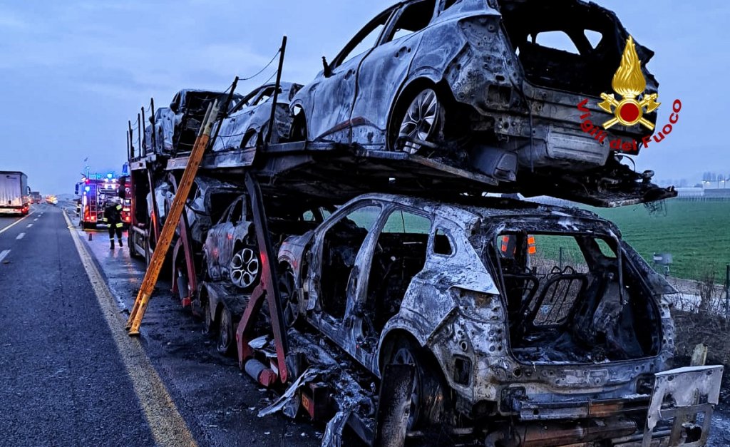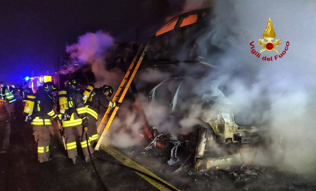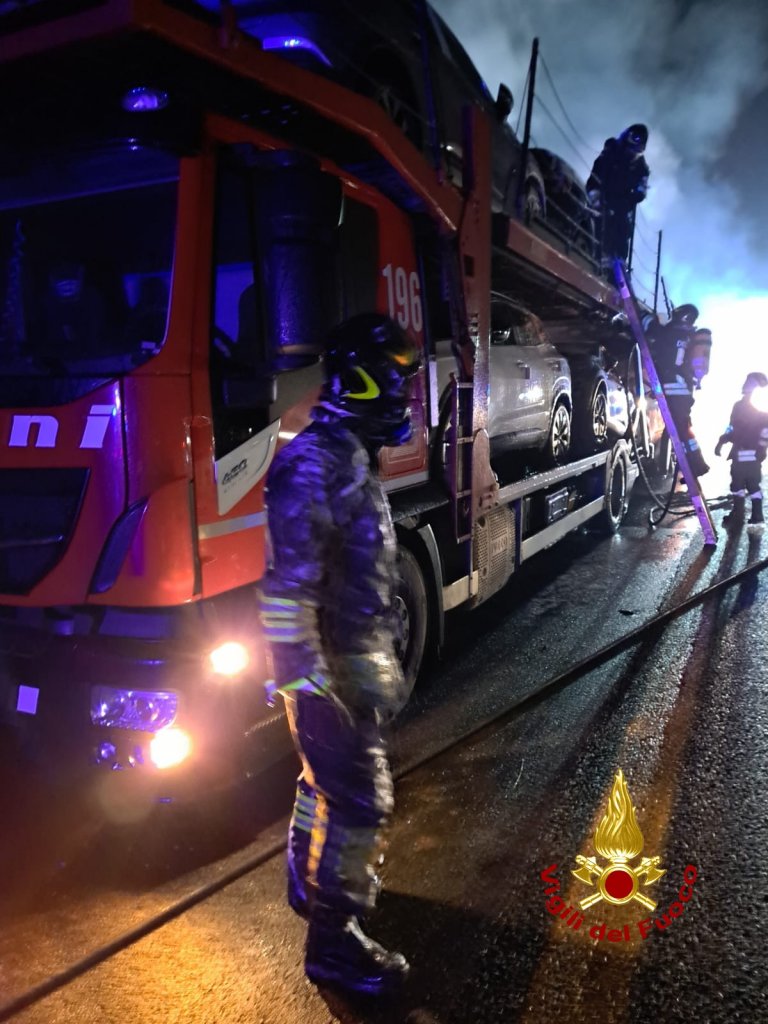 Alle 6:10, di venerdì, i vigili del fuoco sono intervenuti lungo l’autostrada A4, tra gli svincoli di Montebello e Montecchio Maggiore in direzione Venezia per l’incendio di una bisarca, che trasportava 8 auto: illeso l’autista. Il conducente, partito da Brescia e diretto a Pordenone, si è accorto delle fiamme, divampate probabilmente dalle ruote posteriori, le quali si sono subito estese al carico. Ha accostato e chiamato i soccorsi. I vigili del fuoco arrivati da Lonigo, Arzignano e Vicenza con due autopompe, 2 autobotti e 12 operatori, hanno spento il rogo, riuscendo a salvare 2 automobili, che erano state caricate a ridosso della cabina, bruciate le altre 6. Sul posto il personale ausiliario di autostrada e la polstrada. Le operazioni dei vigili del fuoco di completo spegnimento e raffreddamento del mezzo sono terminate dopo circa due ore.
