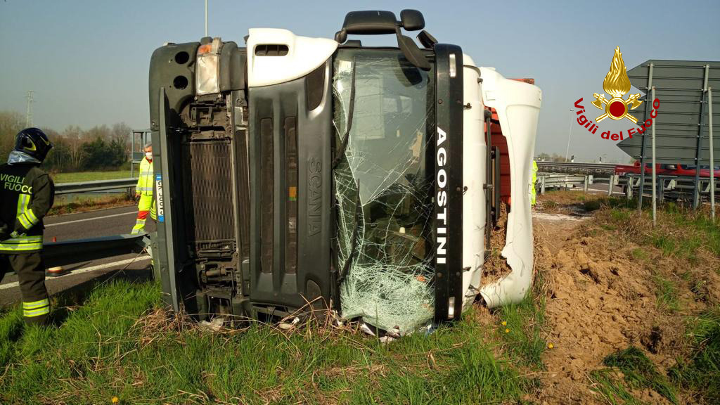 Camion si rovescia lungo la bretella dell’A4 (FOTO)