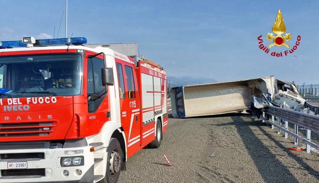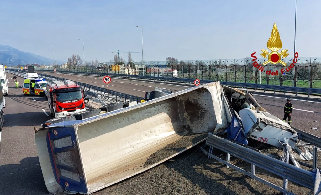 BREGANZE, CAMION SI ROVESCIA LUNGO LA SPV: FERITO L’AUTISTA