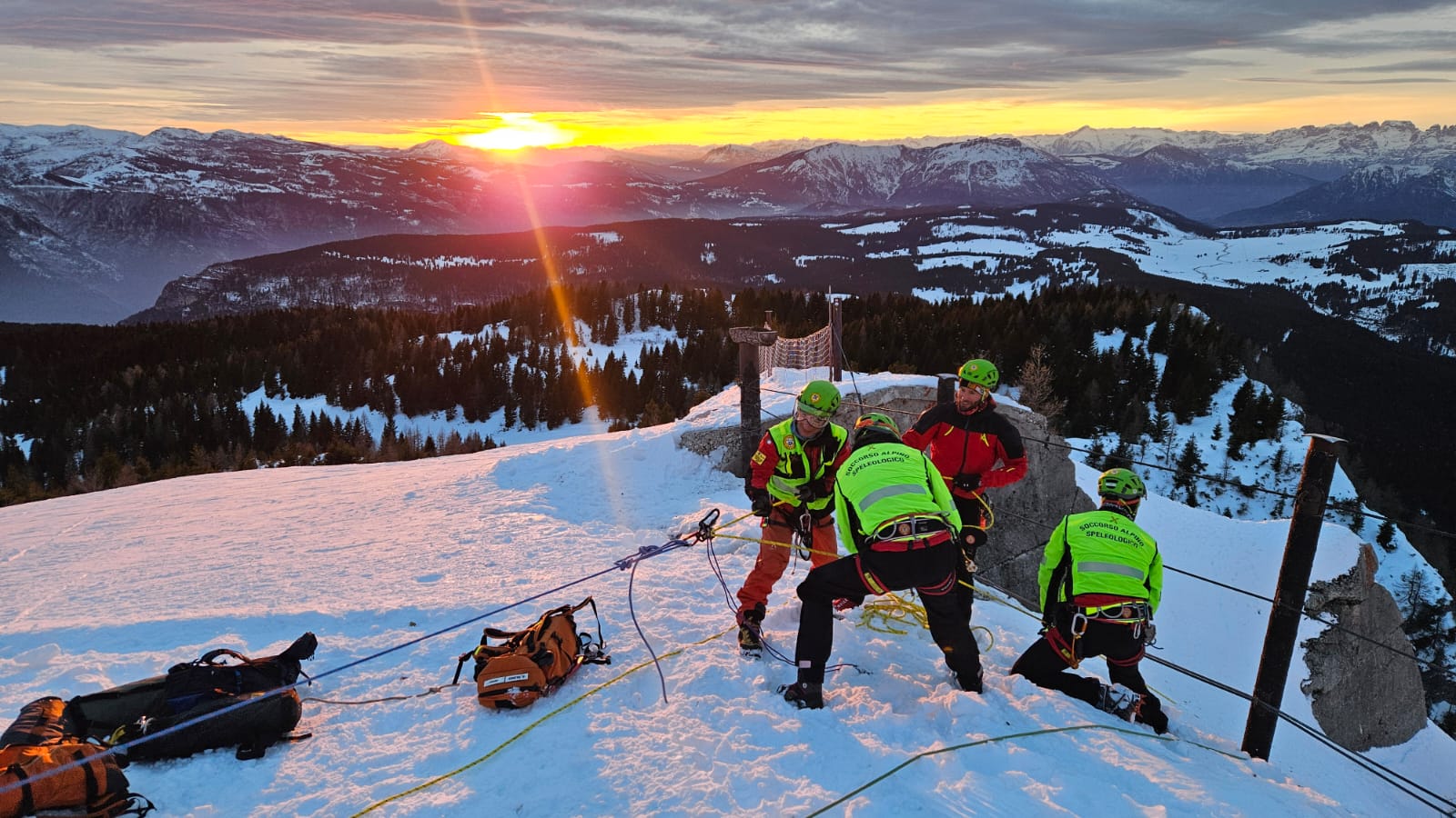 Le operazioni sono poi proseguite per individuare il cane. Non visibile a un primo controllo, Ragù ha infine abbaiato, permettendo ai soccorritori di localizzarla: si trovava molto più in basso, su un terrazzino innevato, semisommersa dalla neve ma viva. Dopo un ulteriore allestimento di corde e una calata di circa cento metri, l’animale è stato raggiunto, legato e riportato a monte, per essere restituito ai proprietari.