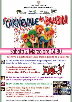Sabato 2 marzo, alle 14.30, il Carnevale dei bambini. A cura di Galleria Parco Città, Associazione Postumia, Club I Sempreverdi, Circolo Ricreativo Montegrappa, Gruppo Alpini Anconetta e San Lazzaro. Alle 15 della sfilata delle maschere nel parco giochi di via Istria e lungo le via del quartiere di San Francesco con il complesso strumentale A. Pedrollo Band di Sovizzo e le Majorettes di Fara Vicentino. Arrivo alla Galleria Parco città con sfilata in maschera e premiazioni. Esibizione Hip Hop della scuola di ballo Beat Streat di Parco Città. Partecipazione libera. In caso di maltempo ritrovo alle 14.30 alla Galleria Parco Città. Info: cirocoscrizione4@comune.vicenza.it