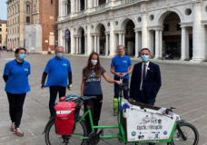 Il vicesindaco Tosetto in piazza con la ciclista che raccoglie la plastica abbandonata