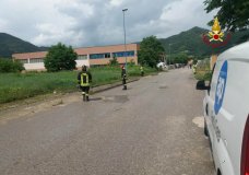 Tubo del gas metano rotto lungo la strada, pompieri al lavoro