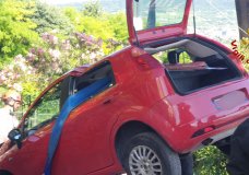 Auto parcheggiata in pendenza parte e finisce contro il tetto di una casa (FOTO&VIDEO)