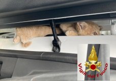 Gattino rosso incastrato nell’auto salvato dai pompieri