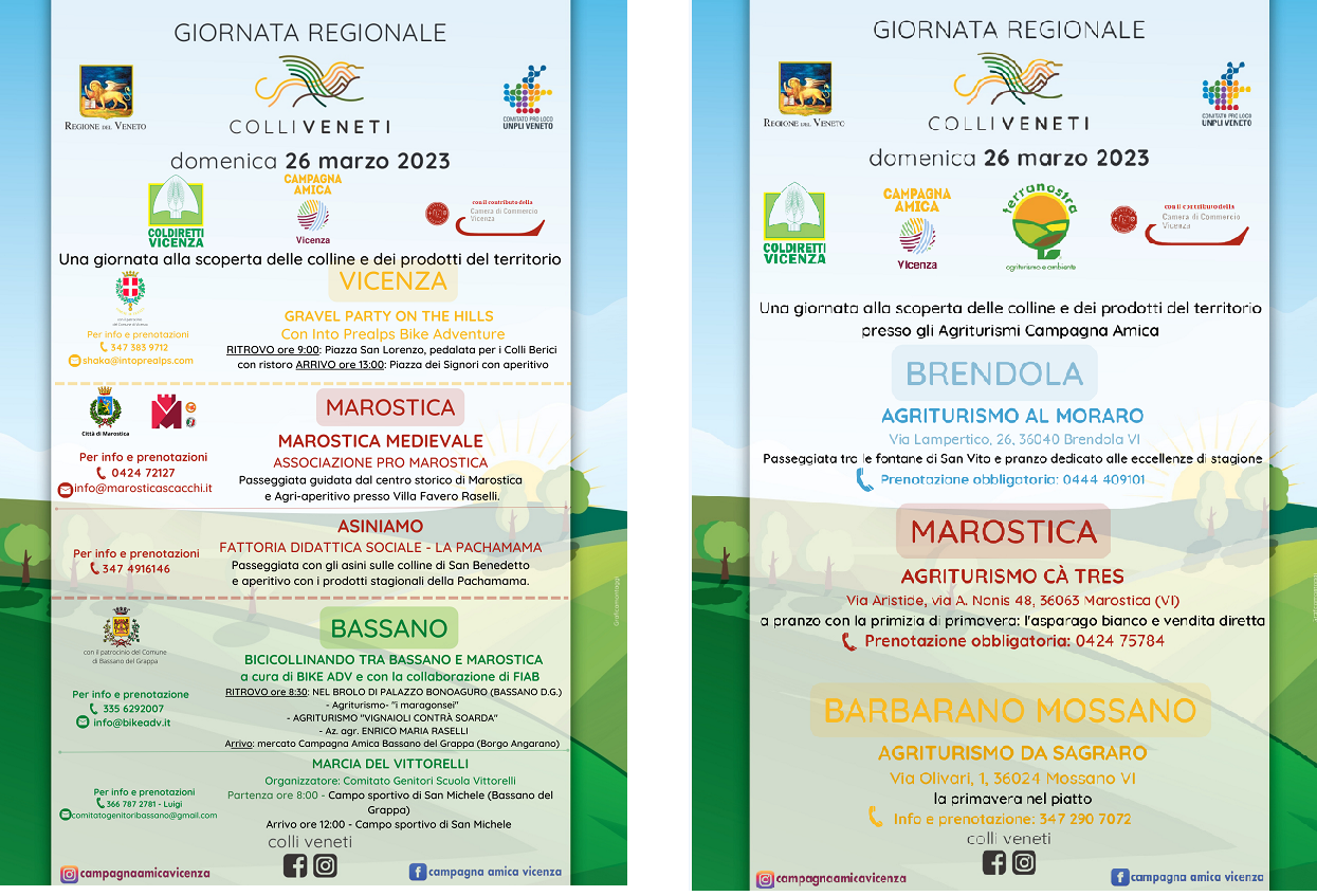I Colli Veneti sono un grande patrimonio, che non sfugge a ciascun viandante, ma che spesso vengono sottovalutati da parte di chi li ha a disposizione a due passi da casa. Per questo la Regione Veneto ha istituito la Giornata dei Colli Veneti, alla quale Coldiretti, Campagna Amica e Terranostra aderiscono, promuovendo attività nel territorio.