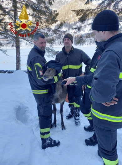 Un cervo è stato salvato dai vigili del fuoco ad Auronzo di Cadore: l’animale stava sprofondando nei pressi della riva del lago ghiacciato. I pompieri sono sono riusciti a legare il cervo e tirarlo fuori dall’acqua.