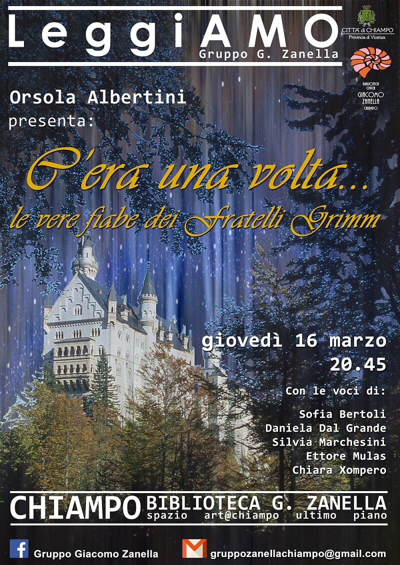 “Il “Gruppo culturale Giacomo Zanella” -spiega l’assessore alla Cultura del Comune di Chiampo, Viola Parise- vi accompagnerà quindi nelle vite di Jacob e Wilhelm Grimm e vi racconterà come si sono sviluppate le loro fiabe, perché furono scritte e quanto fossero in realtà molto diverse dalle versioni che oggi conosciamo”.