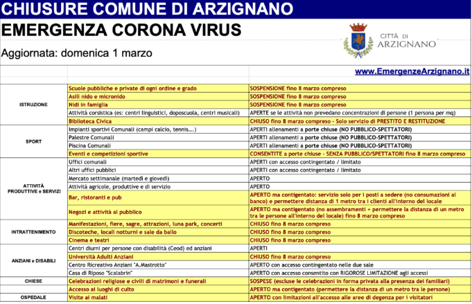 Condividiamo a scopo informativo una tabella esemplificativa creata e diffusa ieri in serata, dopo l’ultimo Decreto, dal Sindaco e dalla giunta di Arzignano con le chiusure (scuole, cerimonie, eventi…) e le limitazioni (per locali pubblici, chiese, ospedali…) per la settimana che va da oggi all’8 marzo compreso.