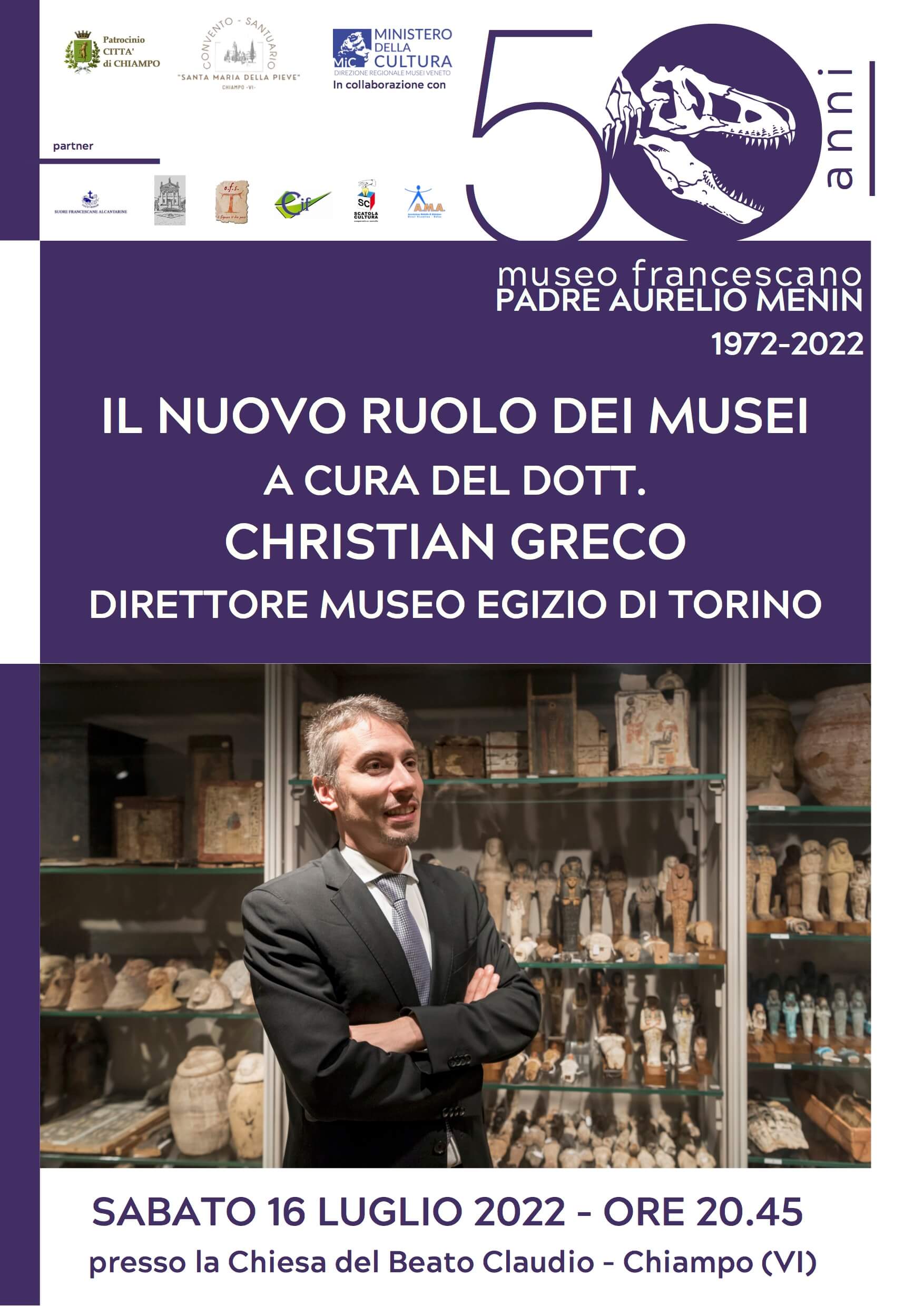 Sarà Christian Greco, Direttore del Museo Egizio di Torino, a presentare sabato sera alle ore 20.45 presso il Museo Francescano della Pieve di Chiampo l’incontro dal titolo “Il nuovo ruolo dei Musei”, in occasione dei 50 anni del Museo Francescano “Menin”.
