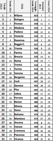 la testa della classifica: Milano con 623 punti è prima e guadagna due posizioni rispetto al 2013; seconda a breve distanza si riconferma Bologna (610 punti), al terzo posto si colloca Firenze (558 punti), con un balzo in avanti di quattro posizioni. In forte crescita anche Venezia, che passa dal 10° al 6° posto e Roma che guadagna 11 posizioni, dal 23° all’12° nel 2014.