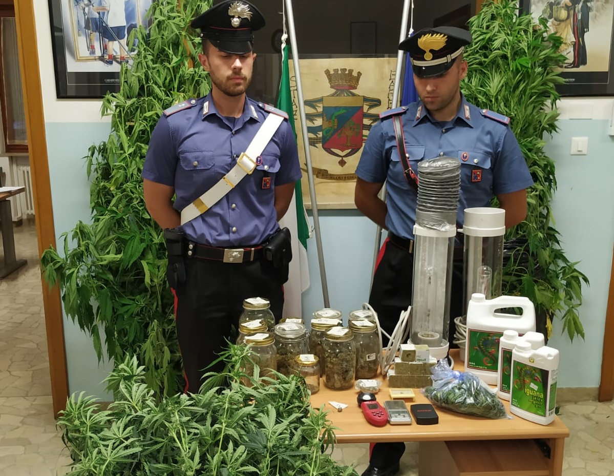 I militari dell’Arma, nella tarda serata del 23 luglio 2020, nel corso di attività investigativa finalizzata a prevenire lo spaccio e detenzione di sostanze stupefacenti, effettuavano una perquisizione nell’abitazione dell’arrestato nel corso della quale rinvenivano gr. 388 di sostanza stupefacente del tipo marijuana già essicata; gr. 162 di sostanza stupefacente del tipo marijuana da essiccare; n. 8 piante del tipo marijuana in vaso dell’altezza di circa cm. 80 rinvenute all’interno di una serra artigianale; n. 9 piante di marijuana dell’altezza variabile fra i cm 150 e i cm 220 rinvenute nell’orto occultate tra le piante di pomodori.