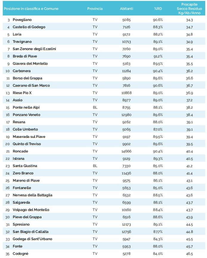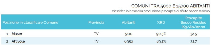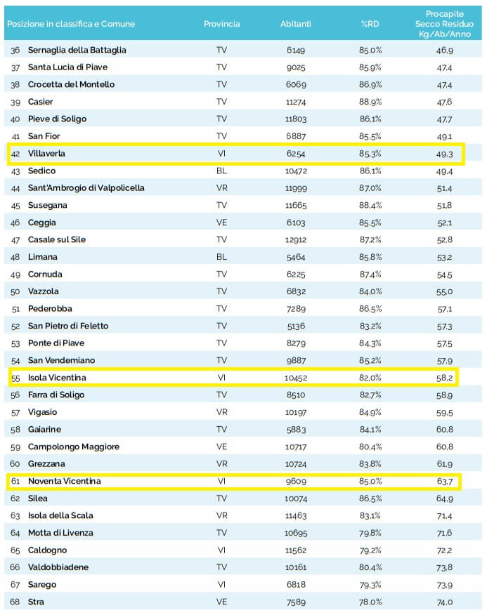 Sorpresa nella classifica veneta dei Comuni fra i 5 e i 15 mila abitanti. Sul podio tre vicentini: Villaverla, Isola Vicentina e Noventa Vicentina. Villaverla raggiunge un 85,3% di raccolta differenziata e 49,3 kg per abitante di rifiuto secco residuo (valore che determina la posizione in classifica). Isola Vicentina differenzia per l’82% con residuo secco di 58,2 kg per abitante e Noventa differenzia all’85% con rifiuto secco di 63,7 kg per abitante. Seguono poi Sarego, Caldogno e Sovizzo.