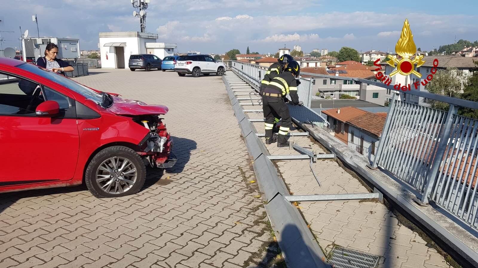 Alle 14:45, i vigili del fuoco sono intervenuti in viale Sant’Agostino a Vicenza per mettere in sicurezza un’auto sul terrazzo di un fabbricato, che durante una manovra da parte della conducente ha divelto il parapetto, rischiando di precipitare dal terzo piano. I vigili del fuoco hanno rimosso la Toyota Yaris e la balaustra danneggiata di cui alcuni pezzi sono stati recuperati sul marciapiedi, nessuna persona è rimasta coinvolta. La conducente che era ha bordo dell’auto con il marito, ha dichiarato un malfunzionamento dell’auto. Le operazioni di soccorso dei vigili del fuoco sono terminate dopo circa un’ora.