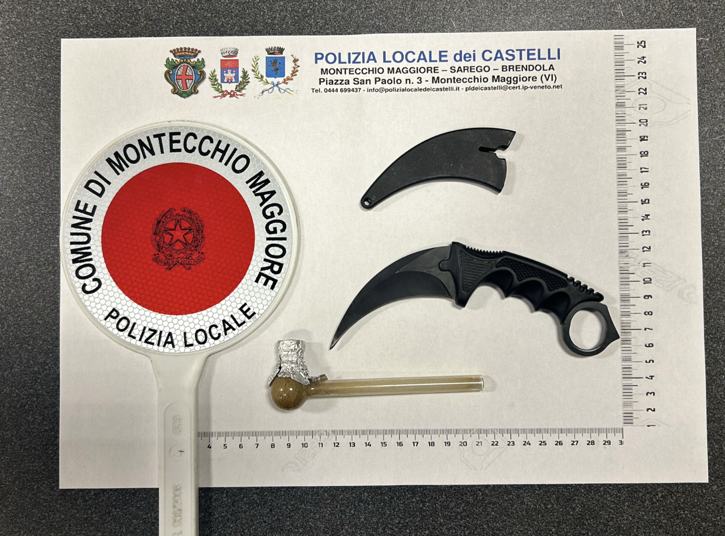 Nel pomeriggio di ieri la Polizia Locale dei Castelli, impegnata nei consueti controlli dei parchi cittadini, ha notato due giovani nel parco “Marinai d’Italia” tra via Conti Gualdo e via Veronese a Montecchio Maggiore. Alla vista degli agenti, i due hanno tentato di nascondere alcuni oggetti, attirando l’attenzione della pattuglia.